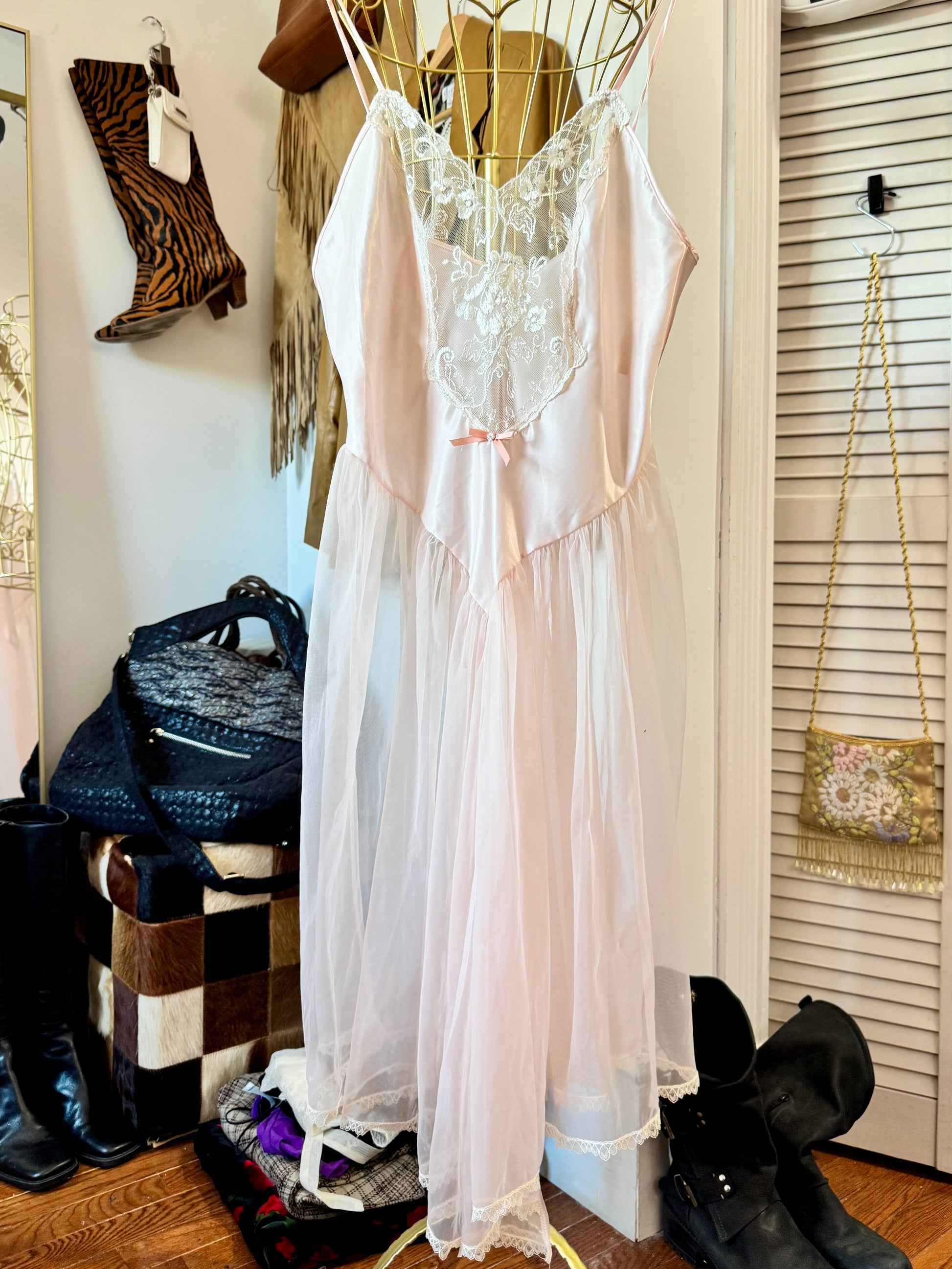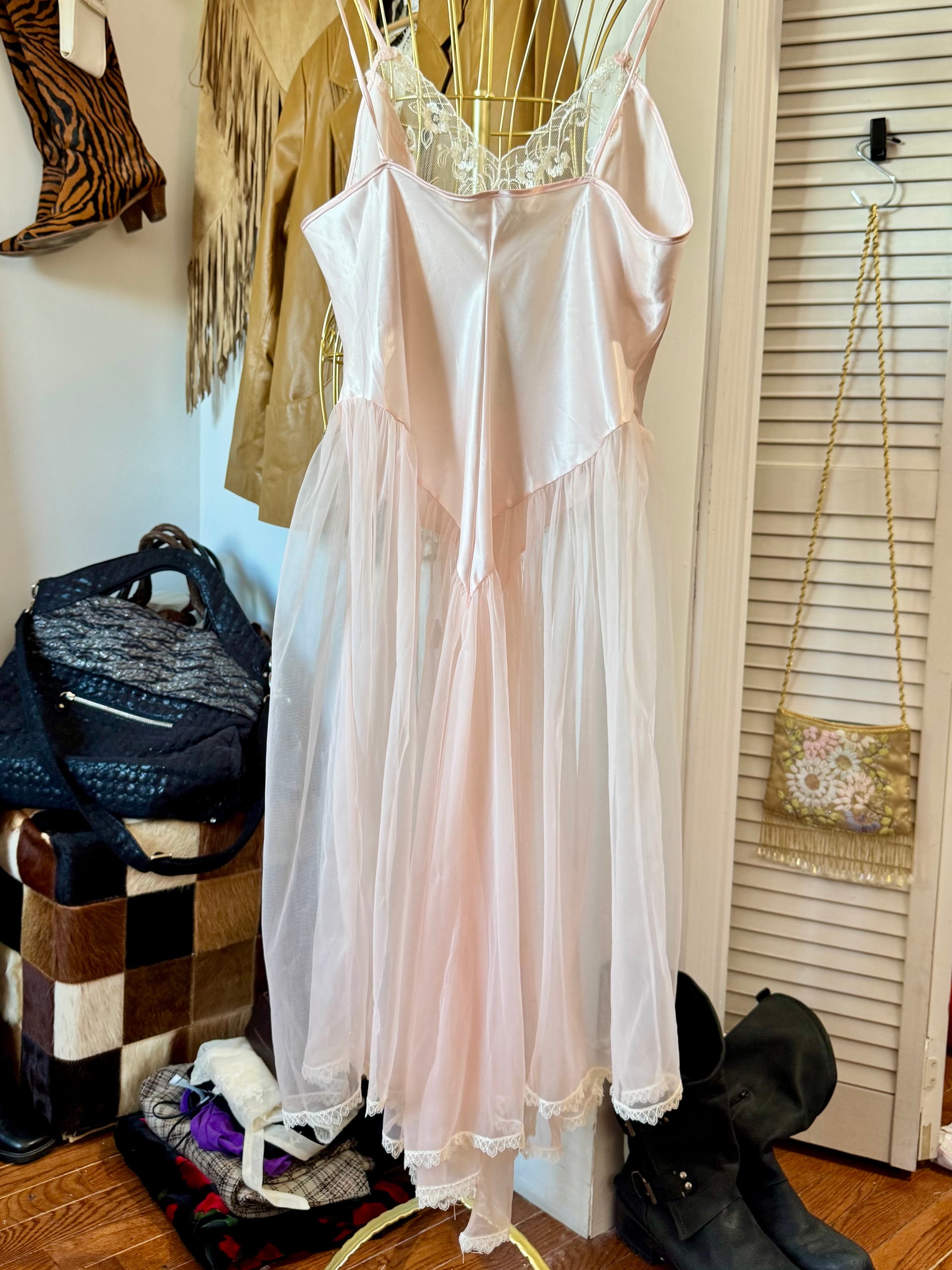 Pale blush satin, floral lace bodice, and a sheer tulle skirt overlay—she’s giving vintage ballerina princess.