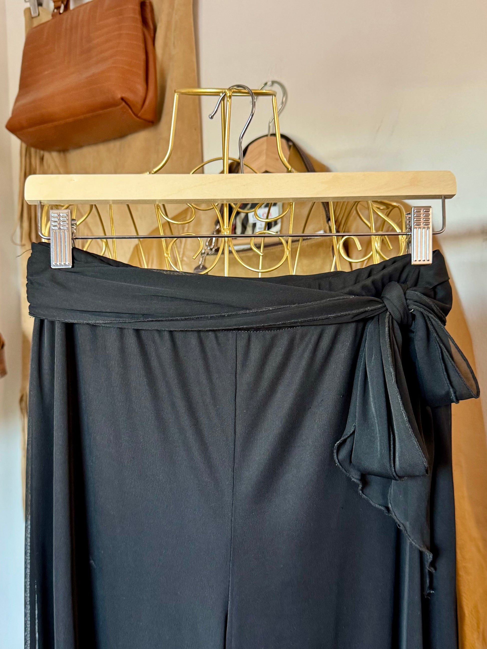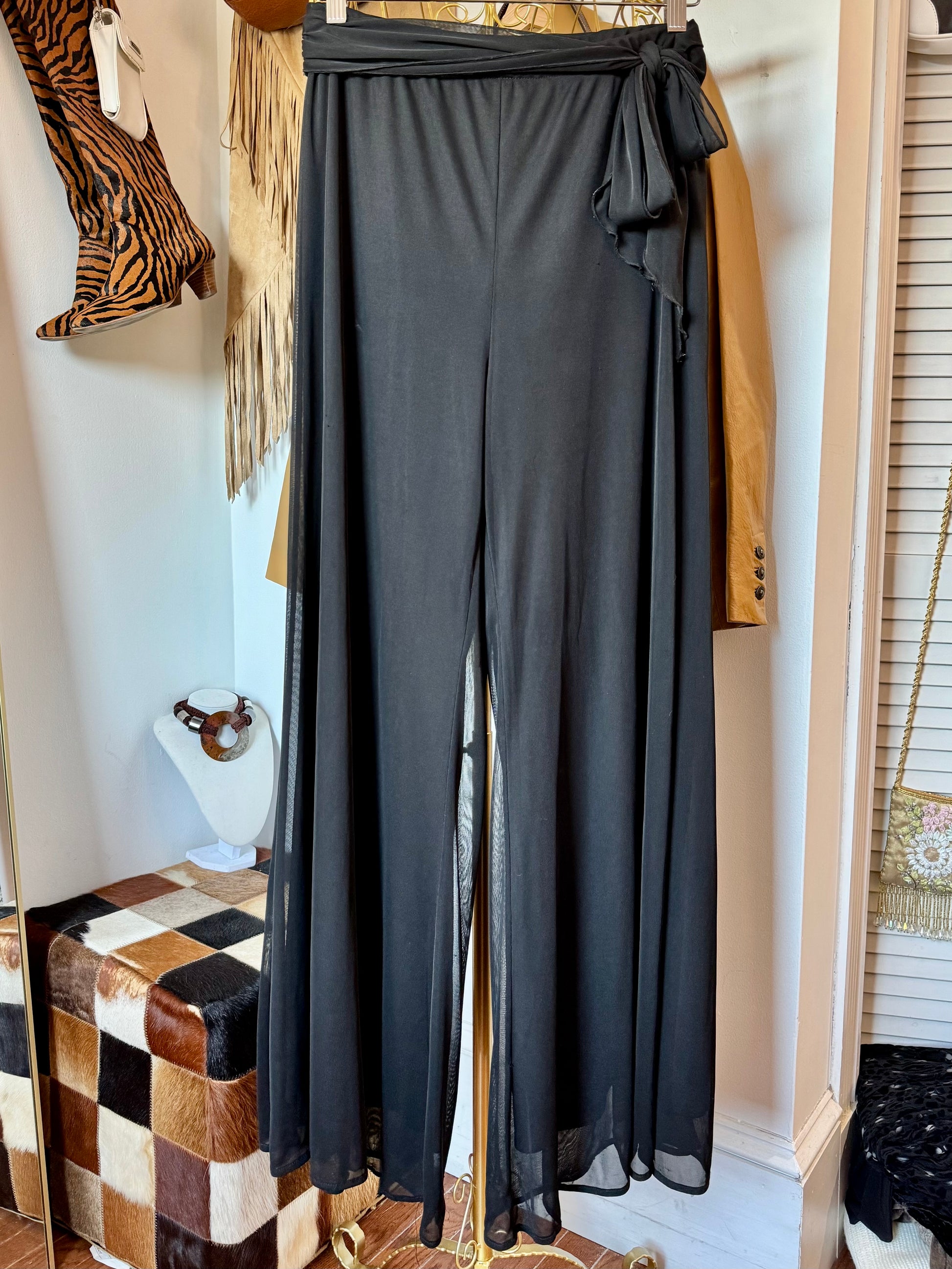 Poetic, airy, and just sheer enough to turn heads — these chiffon-esque pants float with every step. Featuring a dramatic leg slit and a flirty tie waist. Layer over mini shorts or tights for a styling moment.