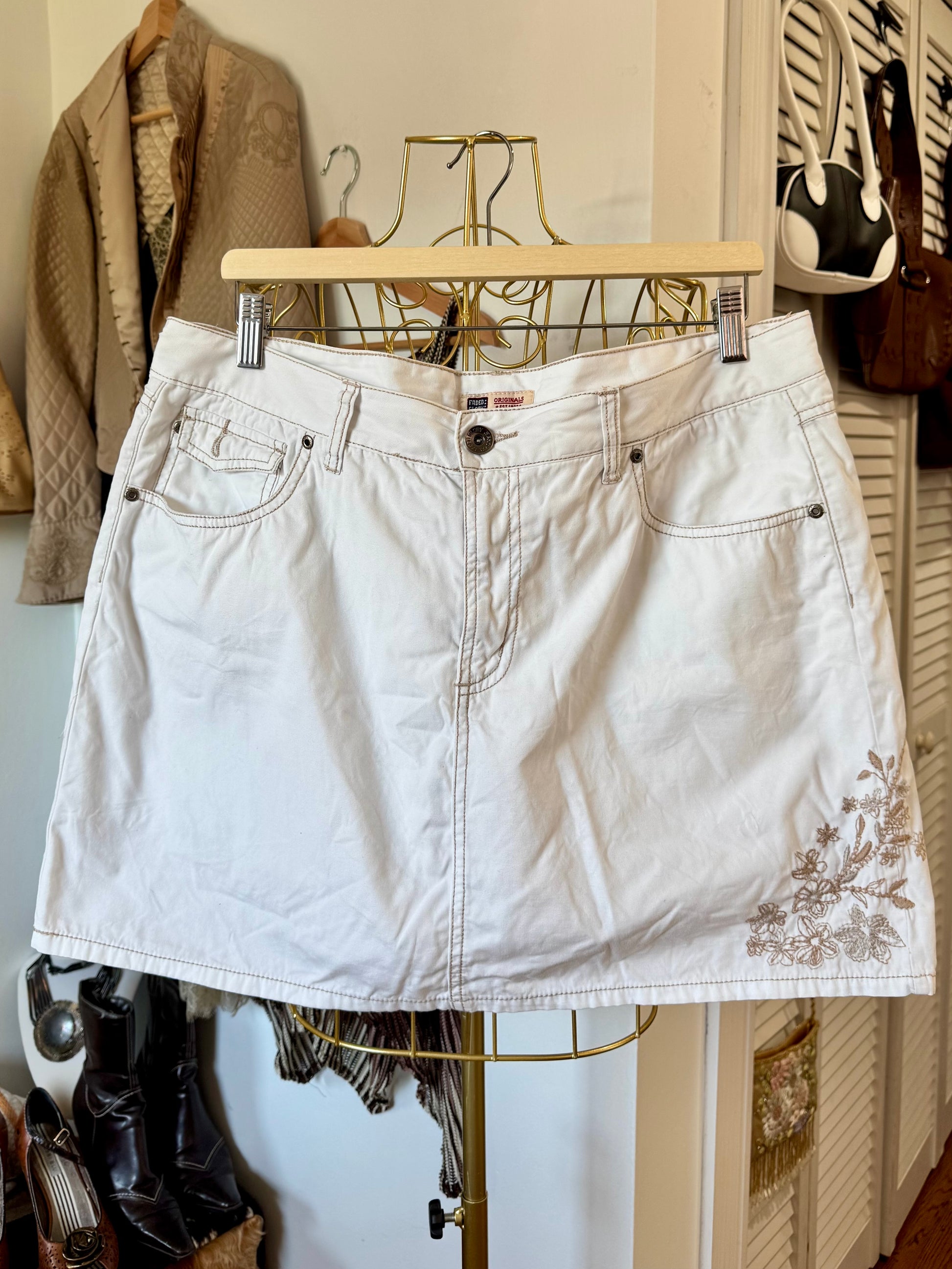 White denim mini skirt with sweet floral embroidery on the hem. A casual cutie with pockets that goes with everything. Style with a baby tee or tank.