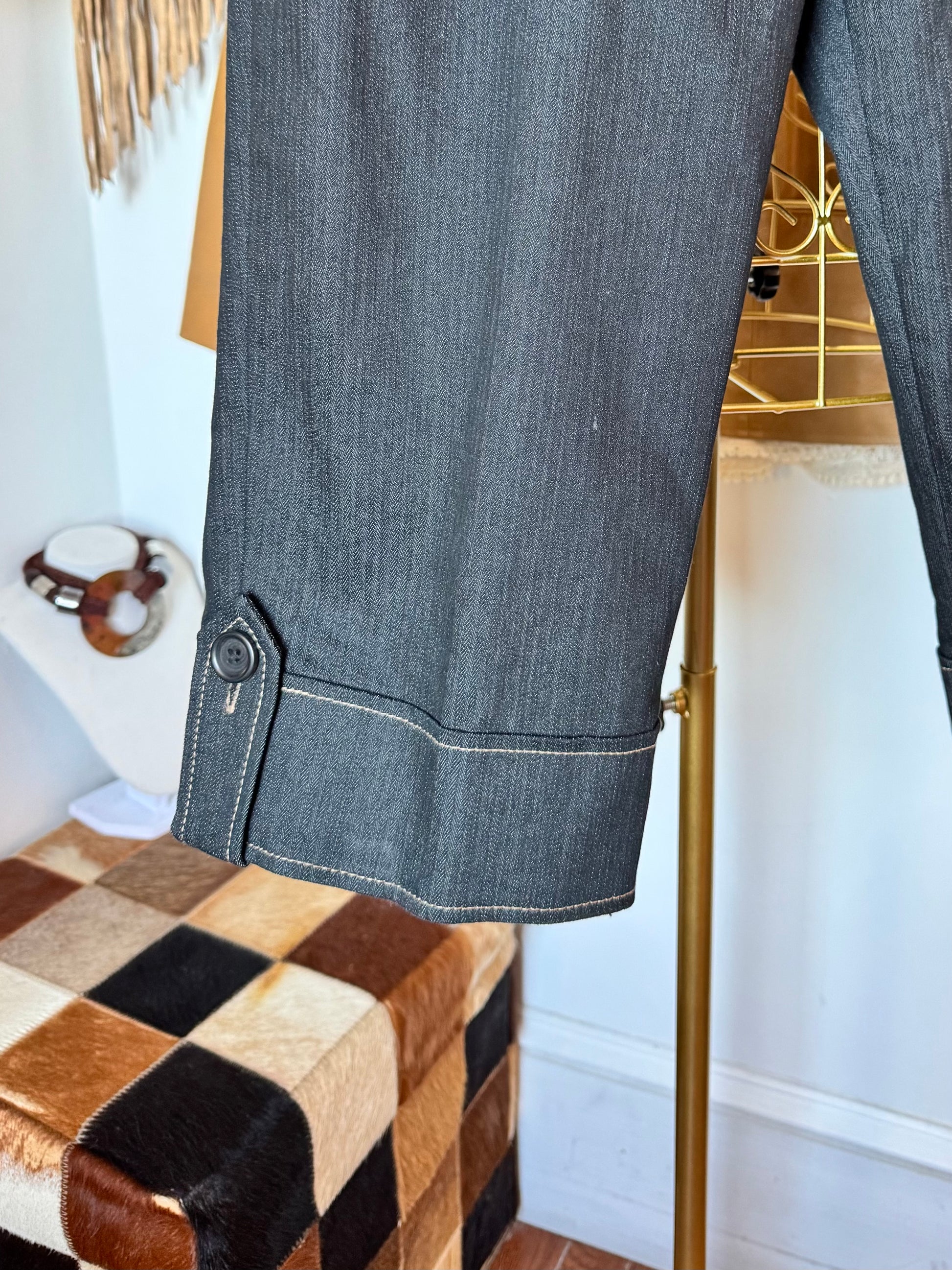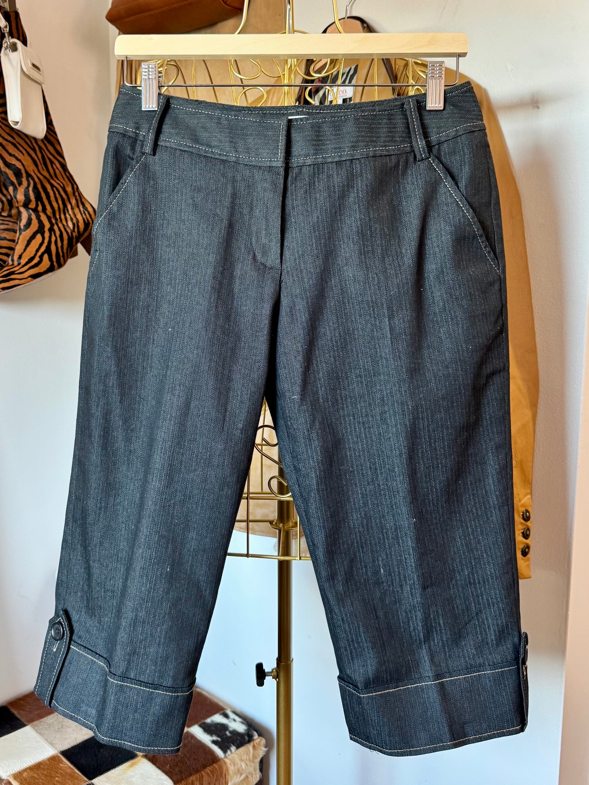 Part office siren, part downtown it-girl. These sleek pinstripe capris hit mid-calf with buttoned cuffs and a tailored fit. A staple for layering — think mesh long sleeve, leather vest, slingbacks.