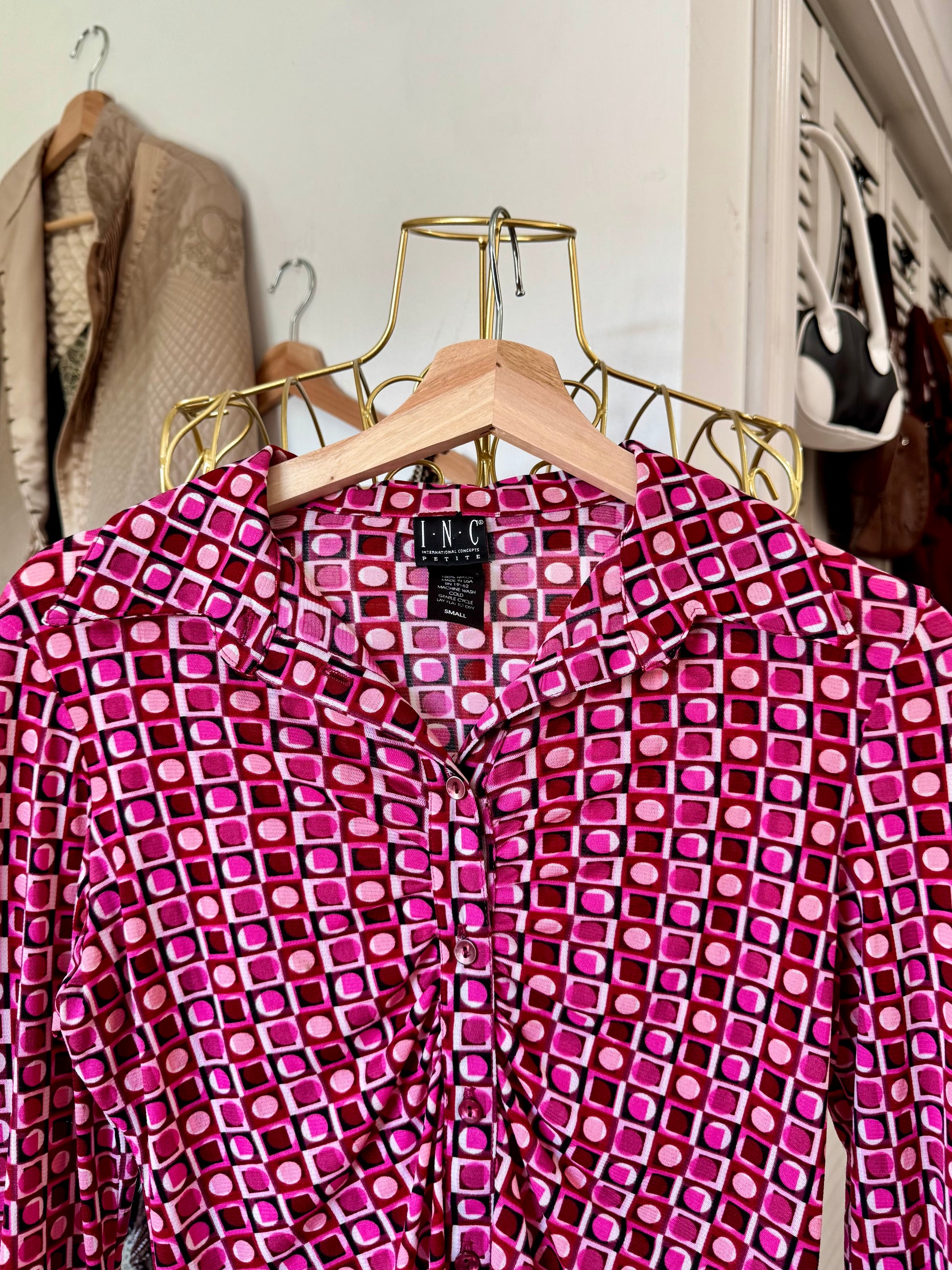 Hot pink + red geometric button-down with a ruched front. Y2K sass meets retro chic.