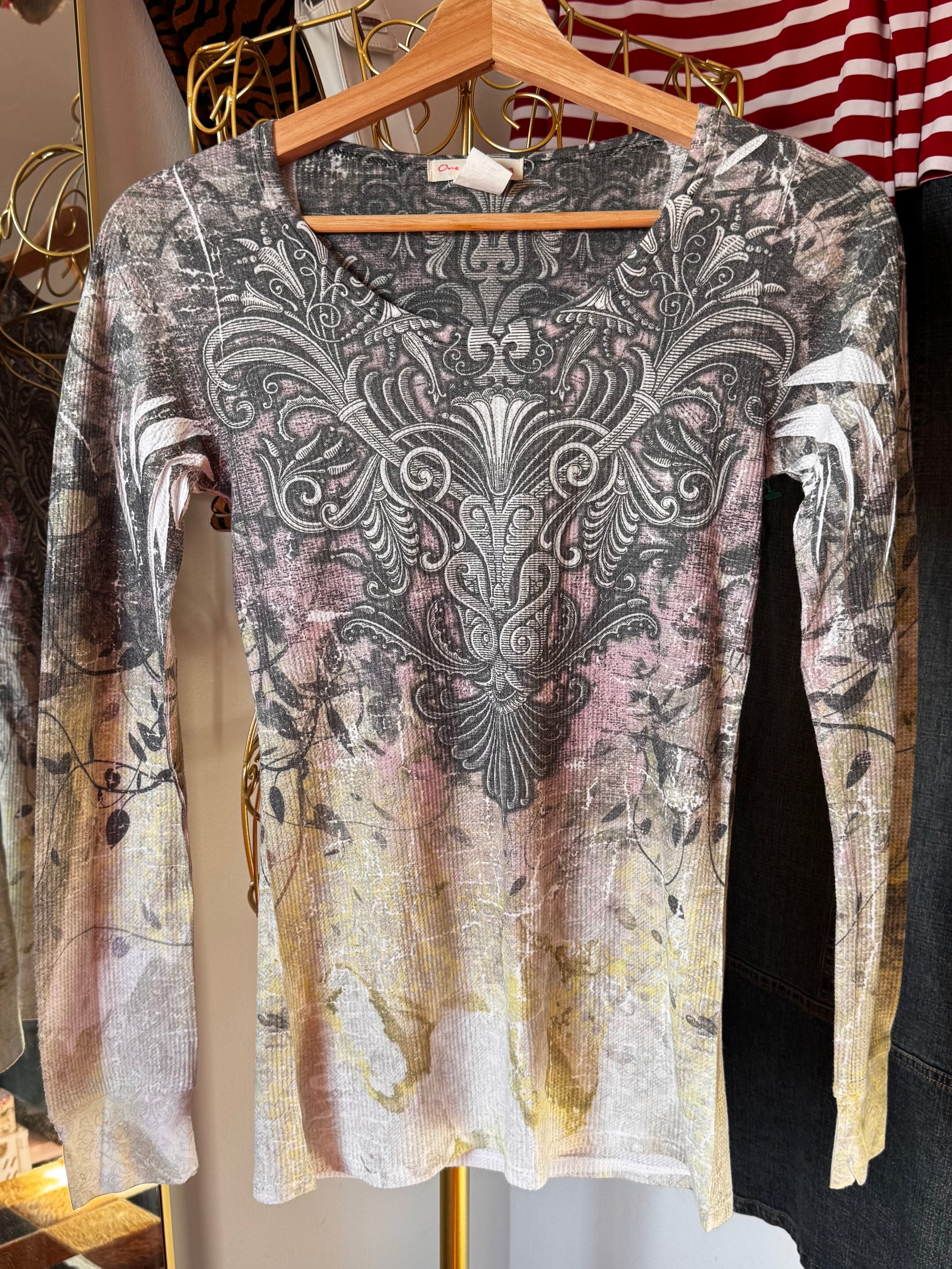 Such a cute long sleeve perfectly mixing edgy with the silver graphic and whimsical with the pink and green color palette!