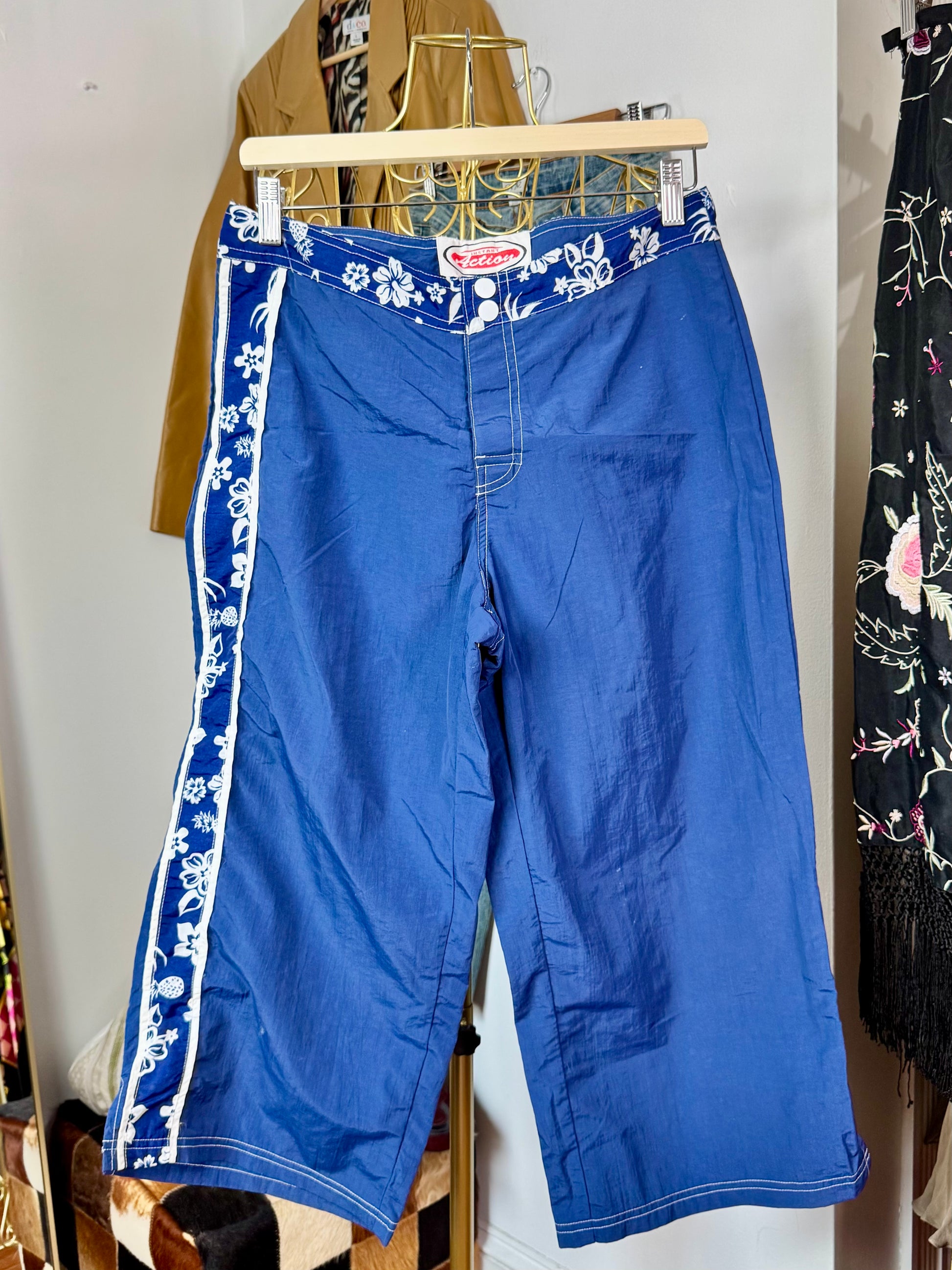 Y2K surf babe realness. These blue wide-leg pants with hibiscus side detailing are giving beach boardwalk in 2004.
