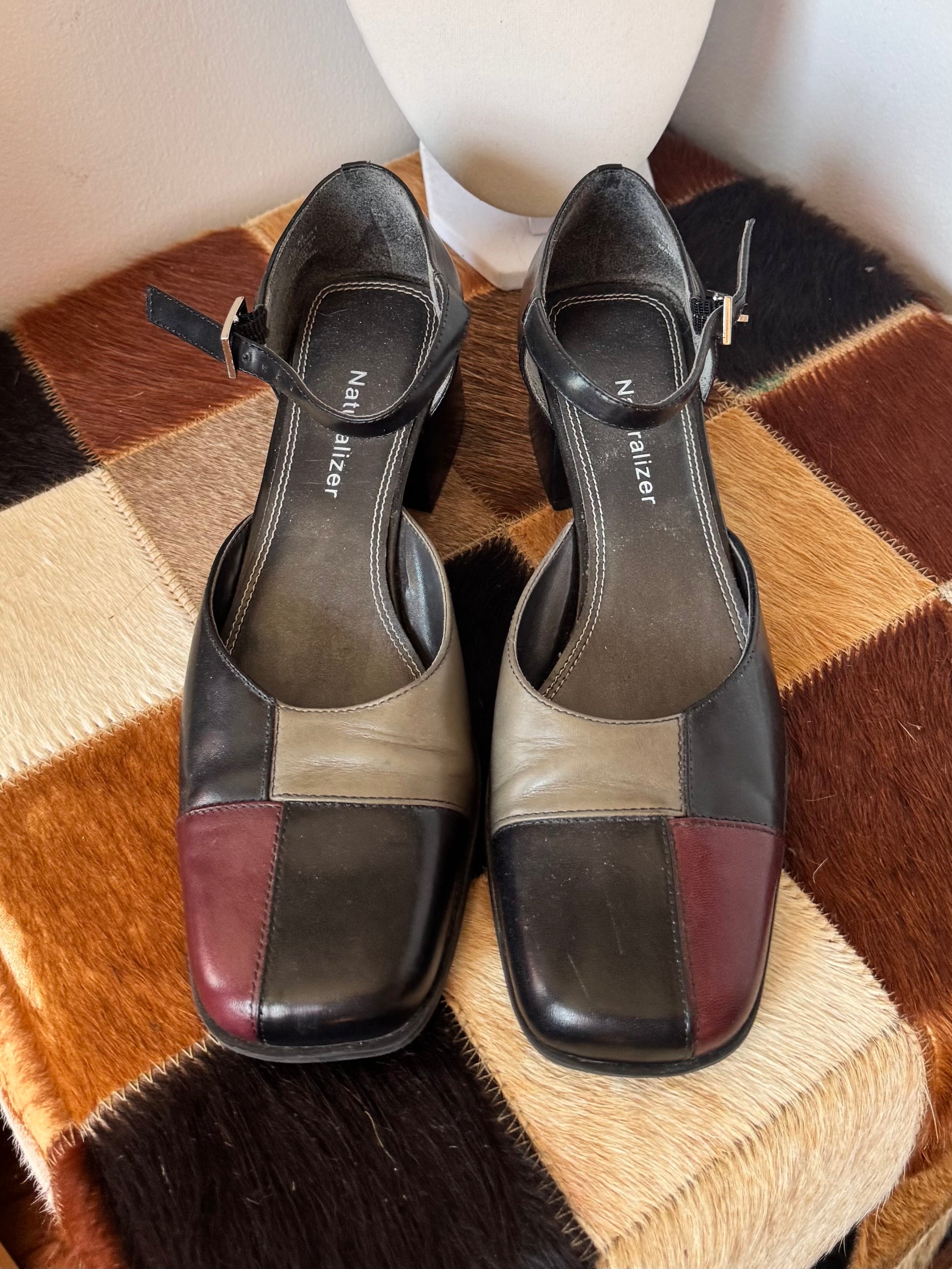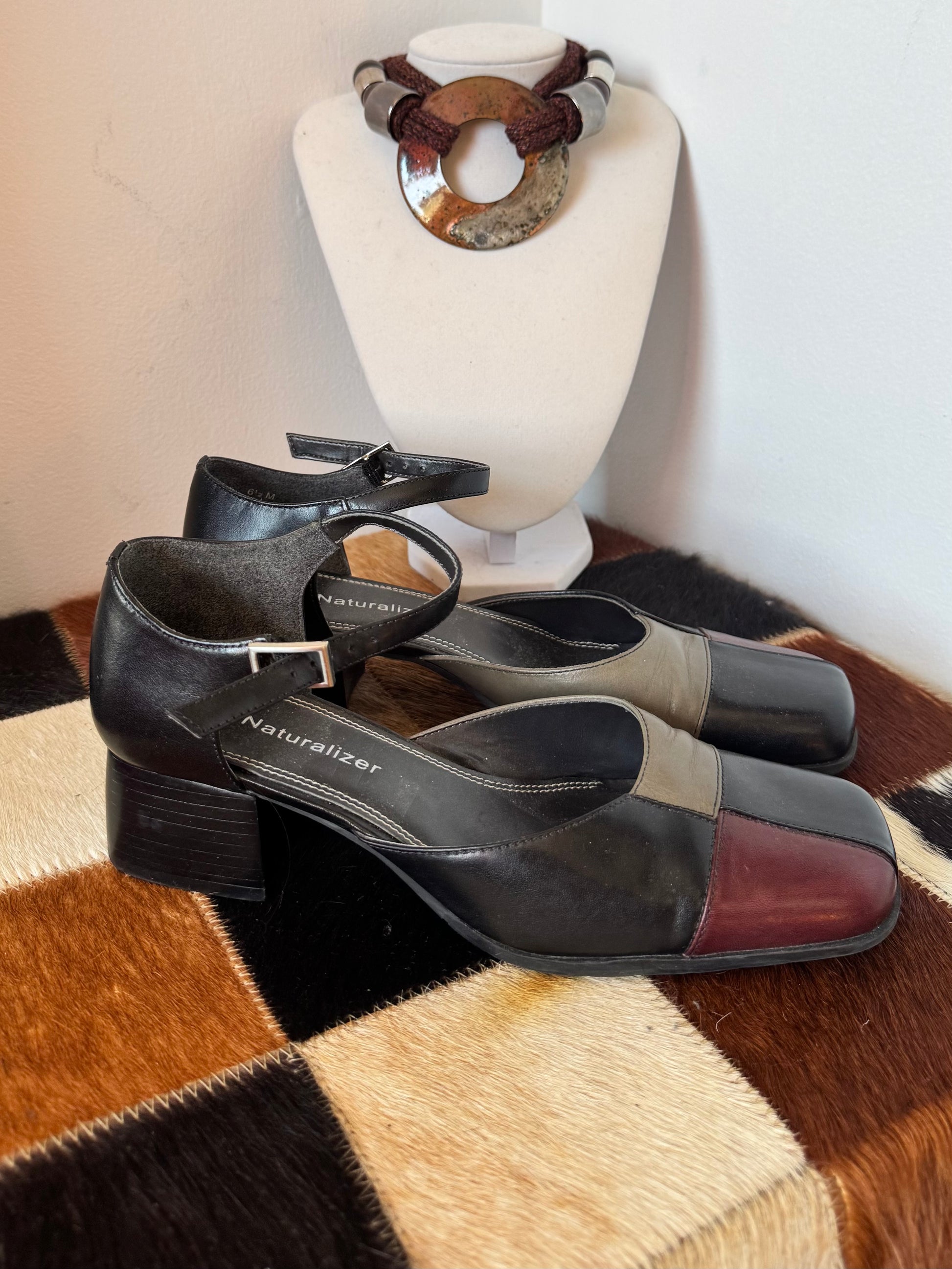 A color-block moment in black, grey, and wine tones—these chunky heels are a stylish nod to retro academia.
