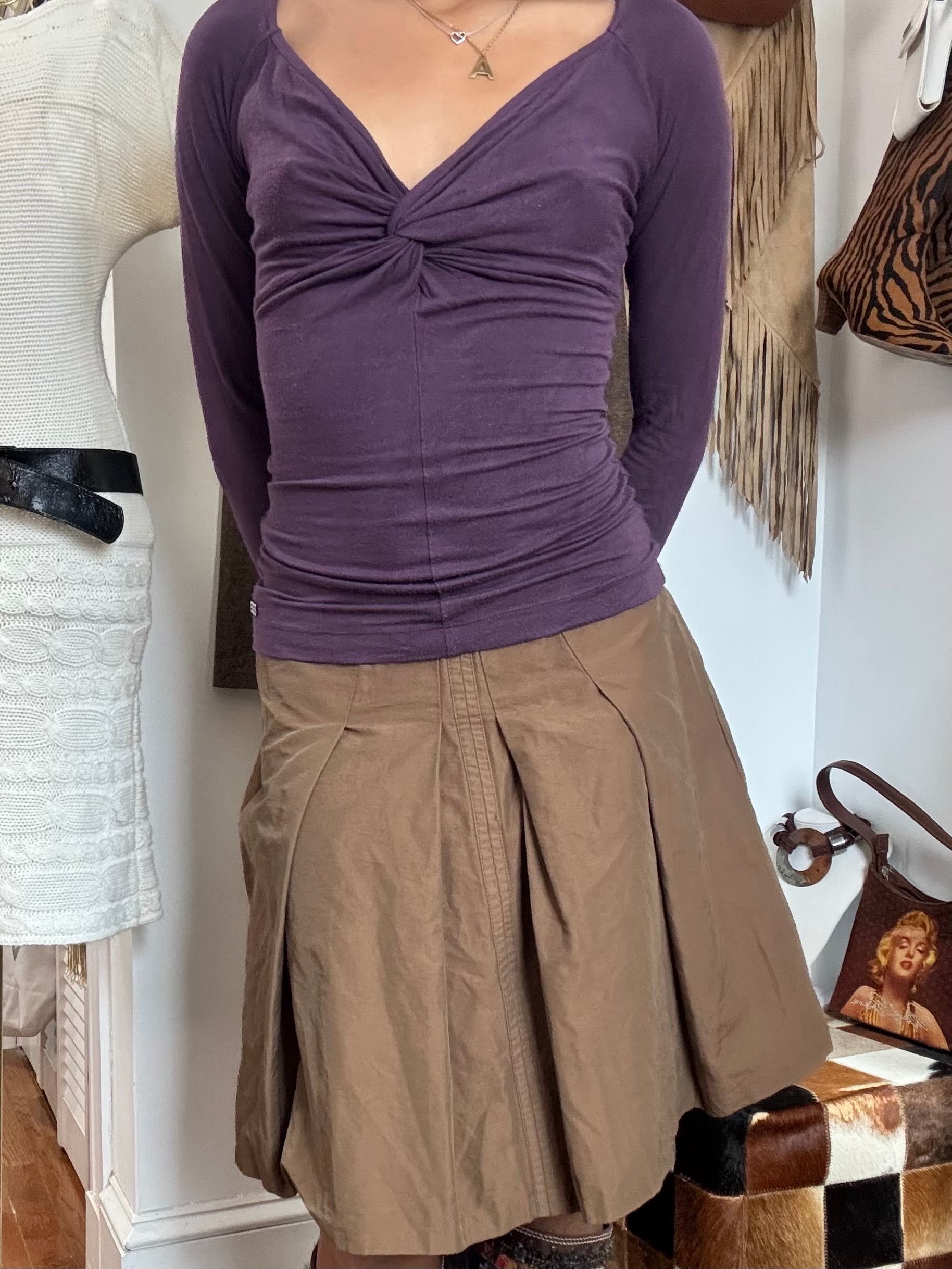 A darling brown midi skirt with elegant pleats to create an almost tutu effect. Create your own monochromatic look with a brown sweater and tall brown boots!