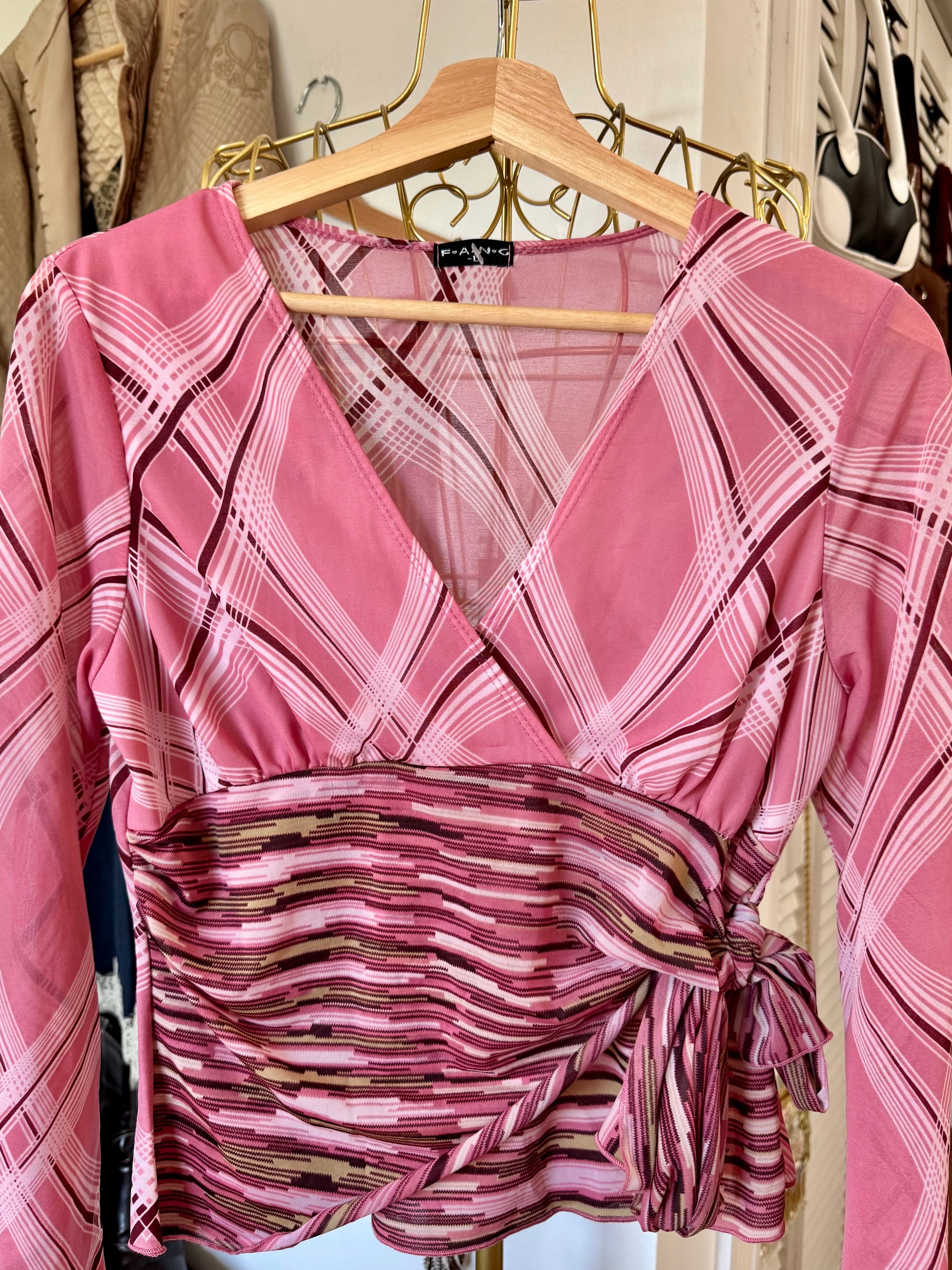 Pink patterned wrap blouse with a striped waist tie. Feminine, flattering, and perfect for date nights.