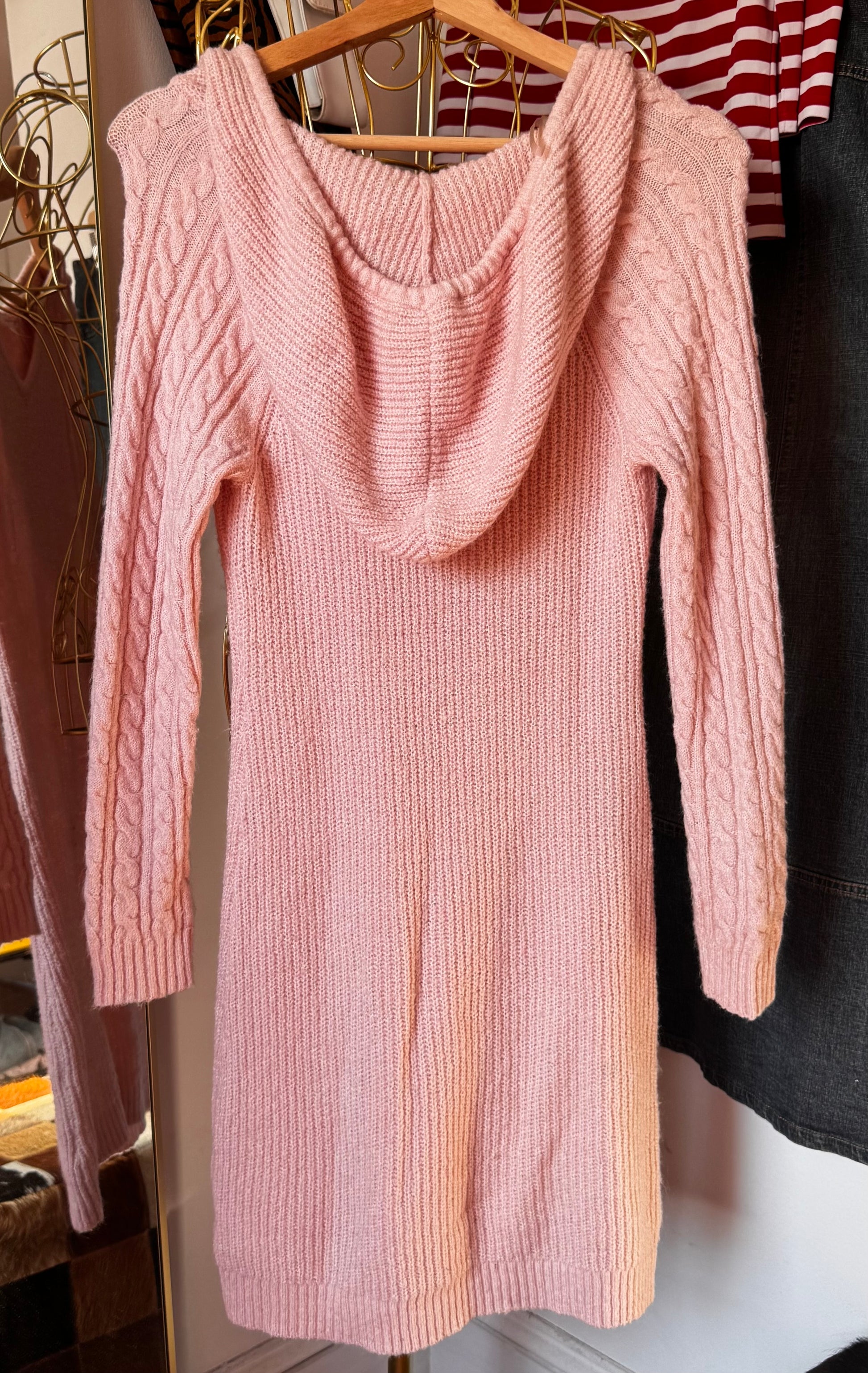 The cutest little pink knit dress with an attached hood! Pink is more subtle and light than harsh in first two photos, 3rd and final photo is more accurate to the color!