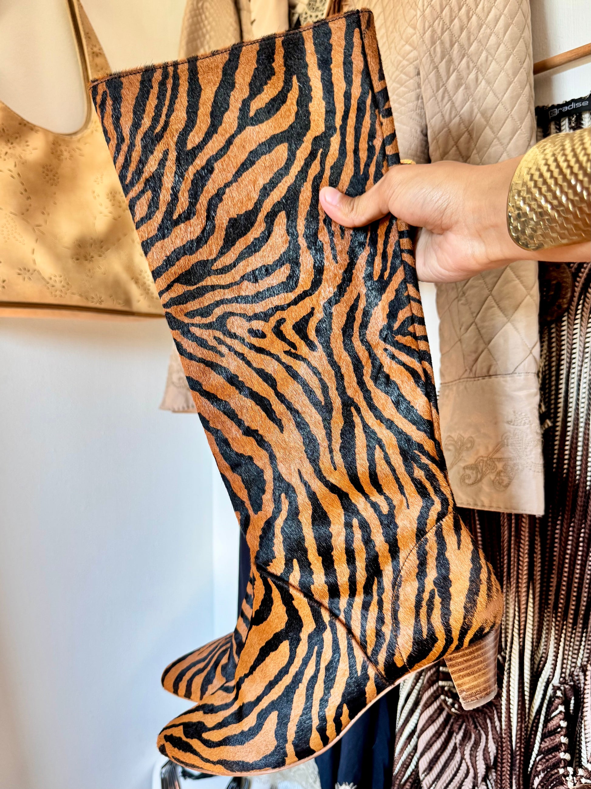Fierce tiger-print calf hair boots with a stacked wooden heel. A true statement piece—wear them loud.