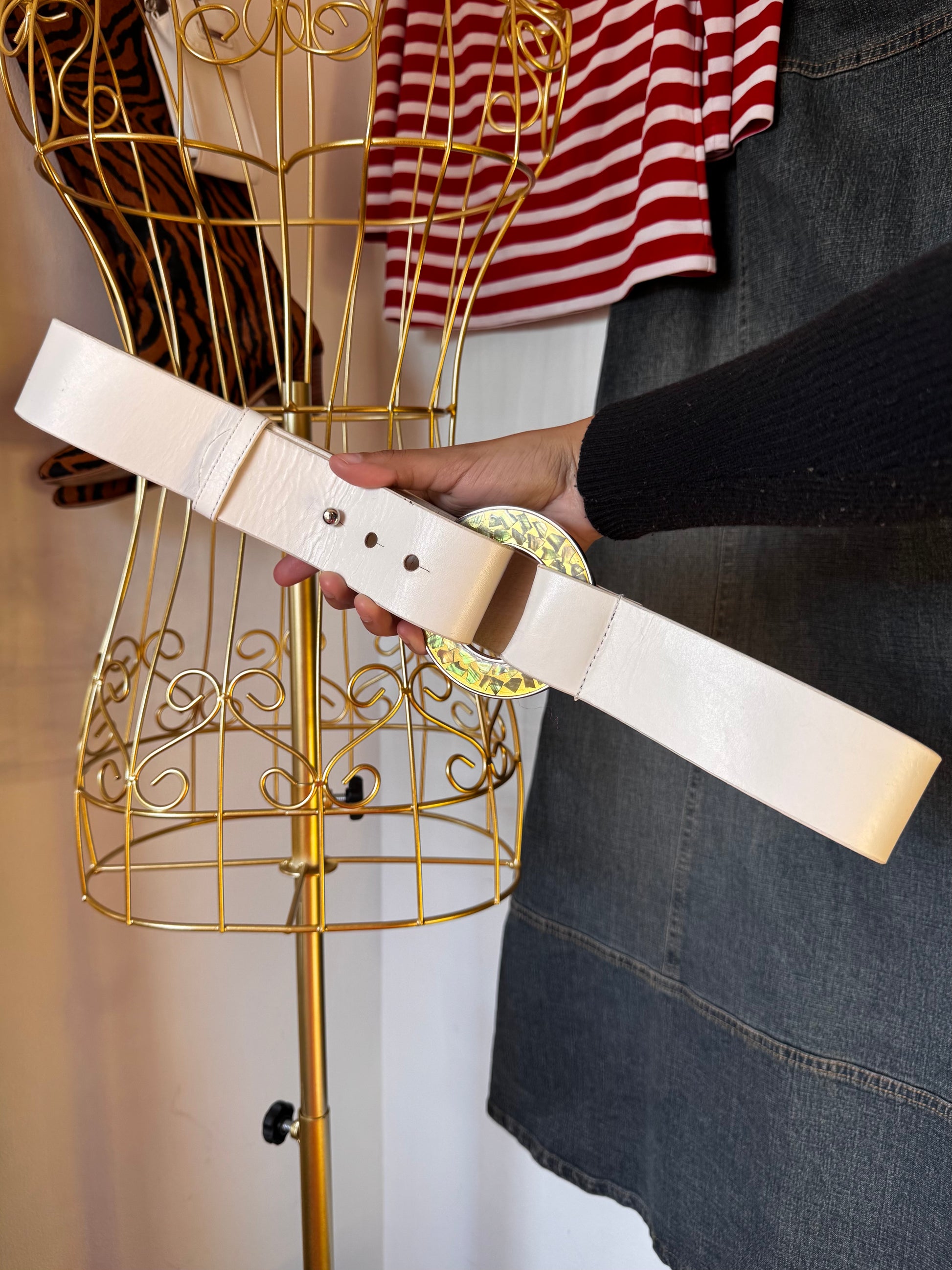 Cute 70s inspired belt with a circular pastel yellow metal buckle, so fun to add to a monotone outfit!